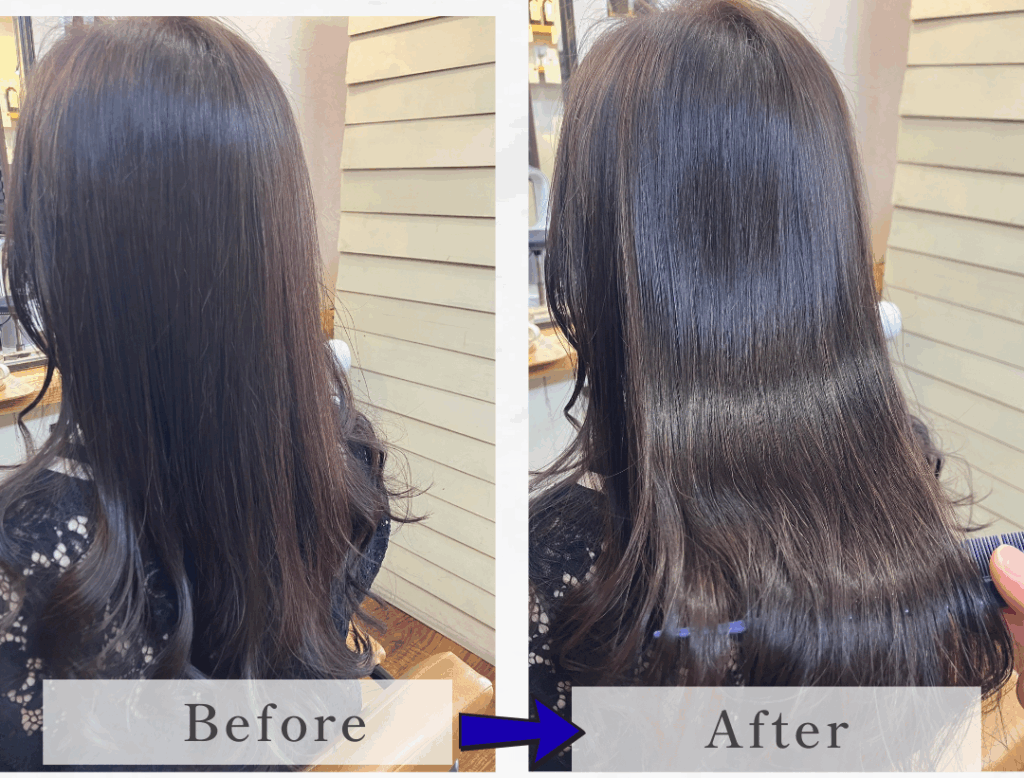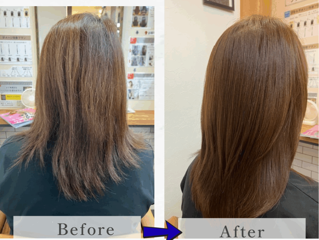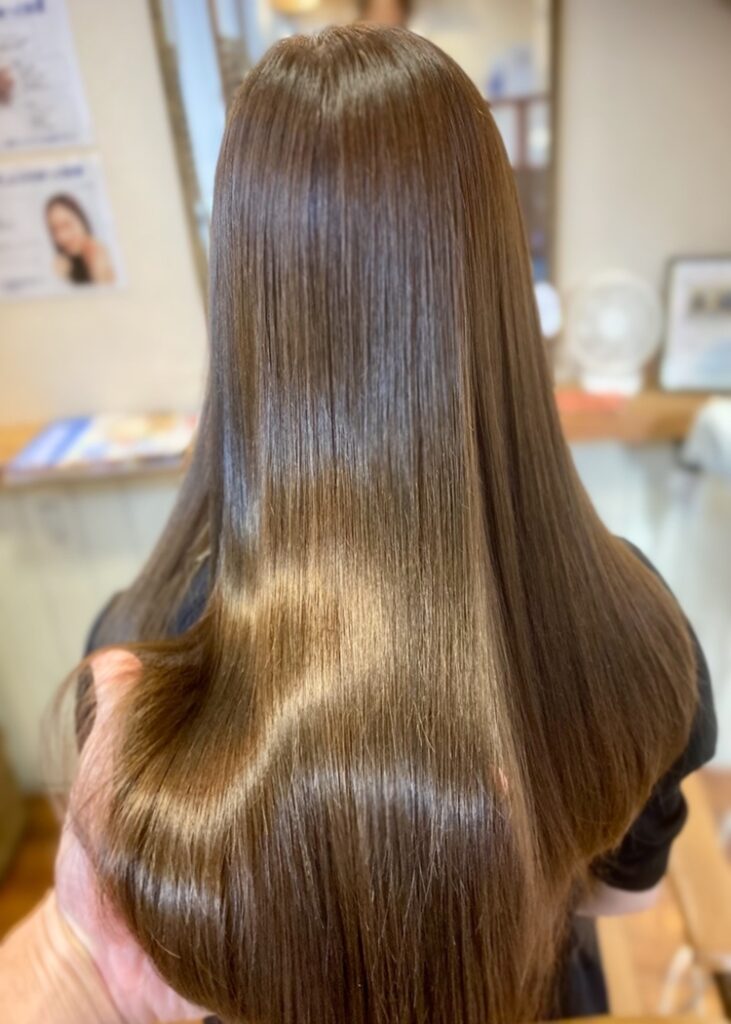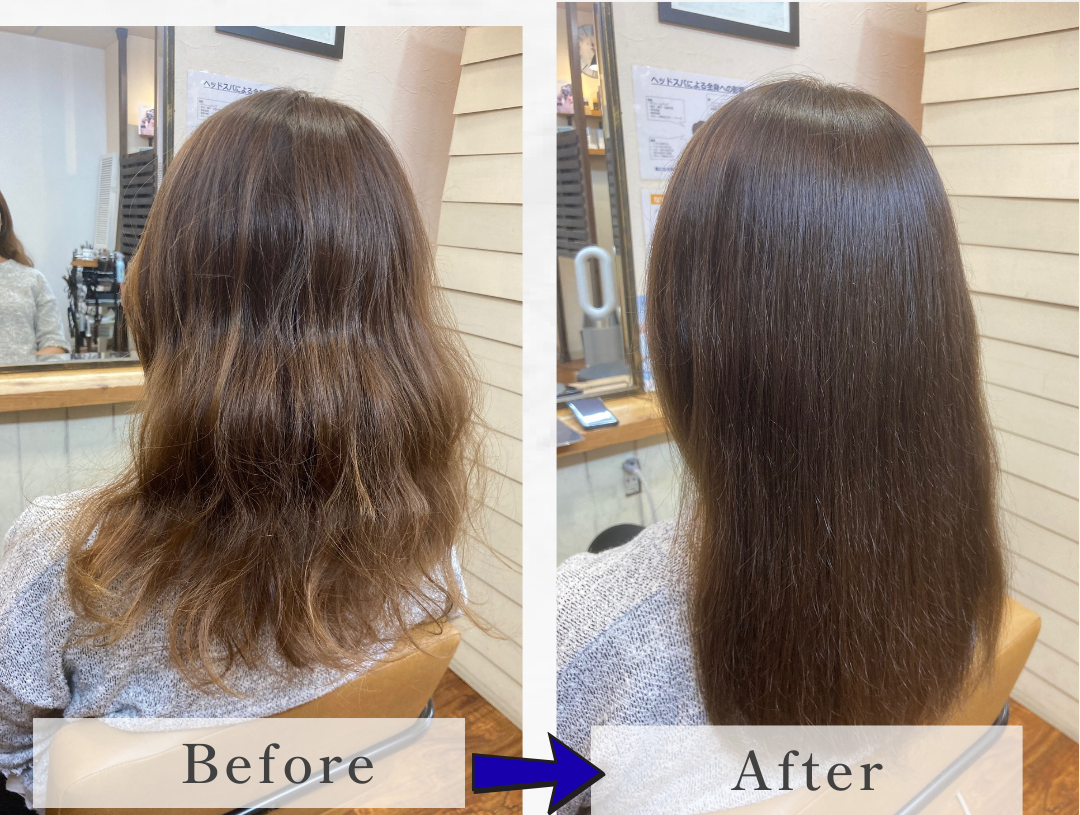髪の状態にもよりますが、施術後、約1〜2か月はツヤや手触りを実感できます。 ダメージの酷い状態ですと、まずあそこを目指していきます。ホームケアでさらに長持ちします。 髪にとって良くないことを止め、いいことを続ければ髪の状態は改善されます。